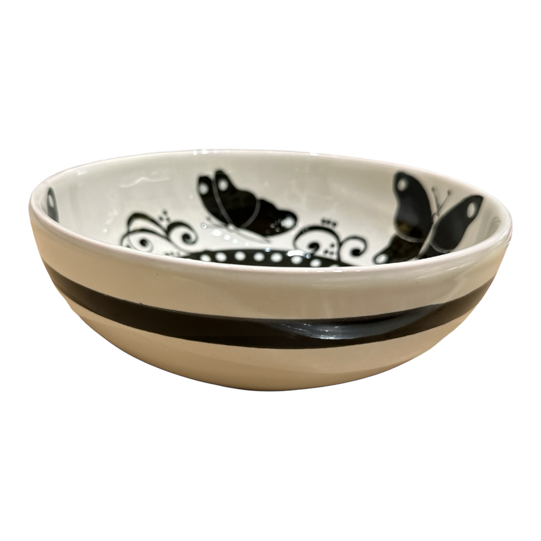 Ciotola lavorata al tornio e dipinta a mano. Collezione L&L Black and White. Diametro 20cm. Bordo bianco.