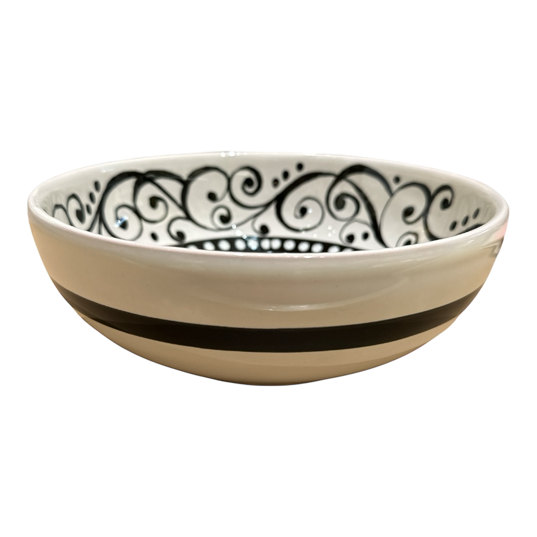 Ciotola lavorata al tornio e dipinta a mano. Collezione L&L Black and White. Diametro 20cm. Bordo bianco/2.