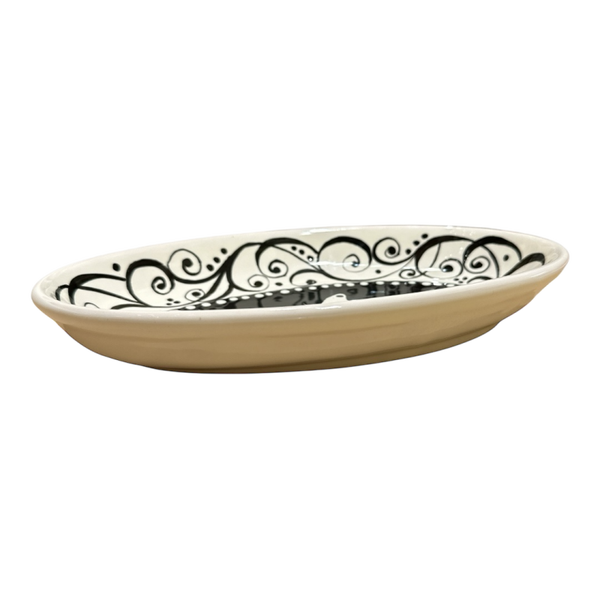 Vassoio ovale in ceramica lavorata e dipinta a mano. Lunghezza 26 cm. Decoro L&L Black and White.