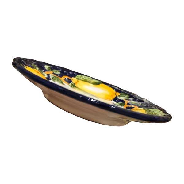 Piatto smerlato per il pane, lavorato e dipinto a mano. Decoro Limone Fondo Blu. Diametro 19 cm.