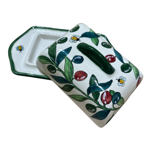 Burriera in ceramica con coperchio, lavorata e dipinta a mano. Decoro Olivo. Dimensioni 19cm x 12cm.