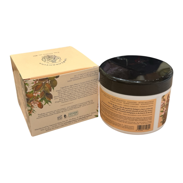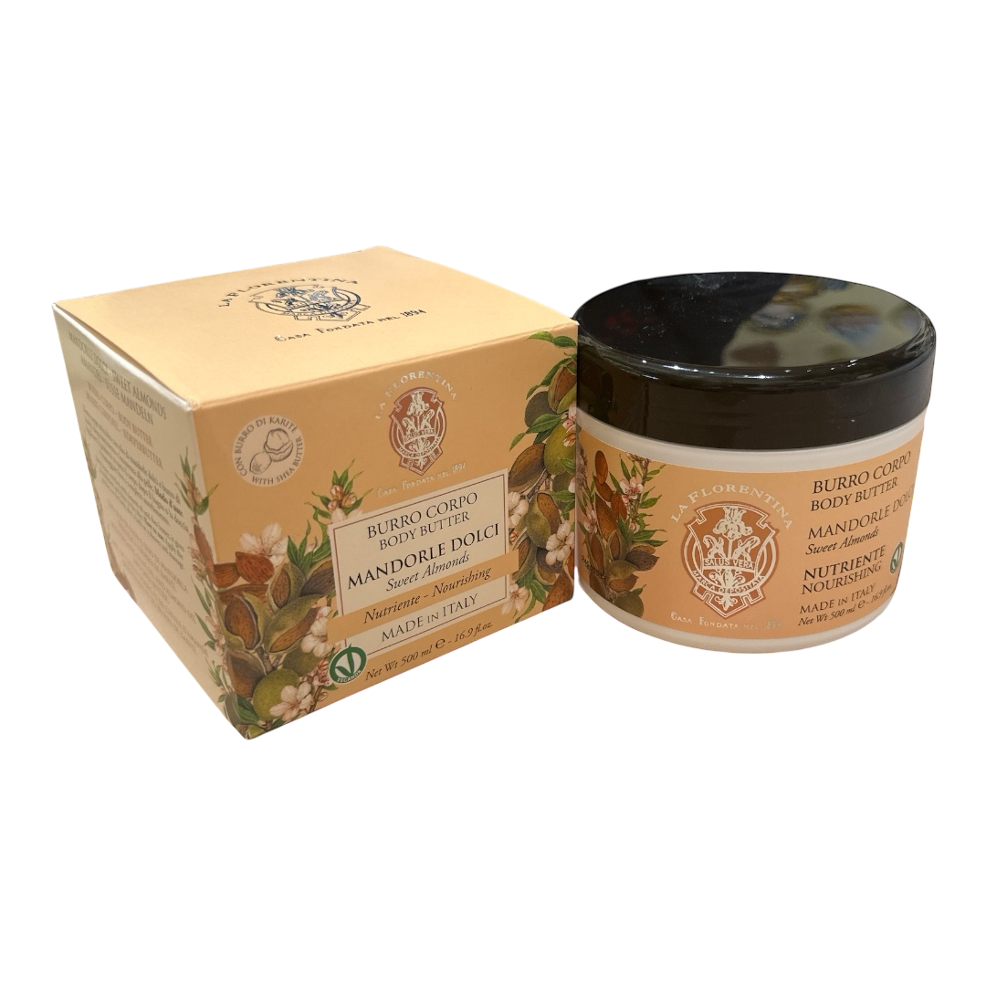 Burro corpo arricchito con olio di mandorle dolci e burro di karité, dona nutrimento e lucentezza alla pelle.